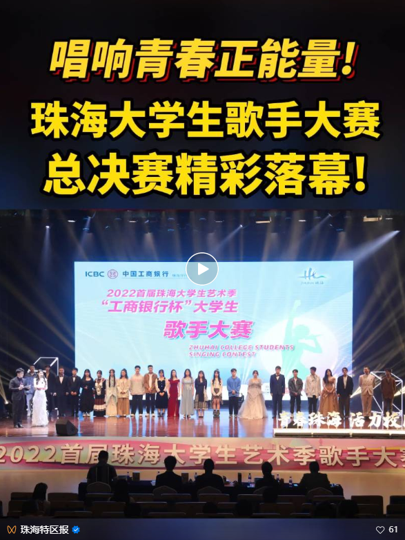 10月30日下午,2022首届珠海大学生艺术季“工商银行杯”大学生歌手大赛总决赛在北京师范大学-香港浸会大学联合国际学院大礼堂举行。大赛由中共珠海市委宣传部、珠海市教育局、共青团珠海市委员会主办,珠海传媒集团承办,工商银行珠海分行独家冠名赞助,今年会官方网站等四家单位联合支持。