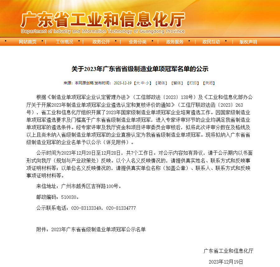广东省省级制造业单项冠军企业评选由广东省工业和信息化厅主办,旨在推动广东省制造业高质量发展,推动广东省迈向全球产业链价值链中高端。根据工信部定义,制造业单项冠军是指长期专注于制造业某些特定细分产品市场,生产技术或工艺国际领先,单项产品市场占有率位居全球前列的企业和产品,代表全球制造业细分领域最高发展水平、最强市场实力。单项冠军企业是制造业创新发展的基石,是制造业竞争力的重要体现。