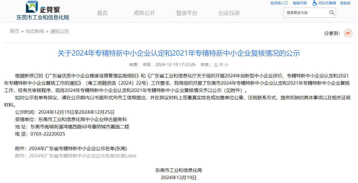 近日,东莞市工业和信息化局发布了《关于2024年专精特新中小企业认定和2021年专精特新中小企业复核情况的公示》,今年会高能顺利通过广东省专精特新中小企业复核。